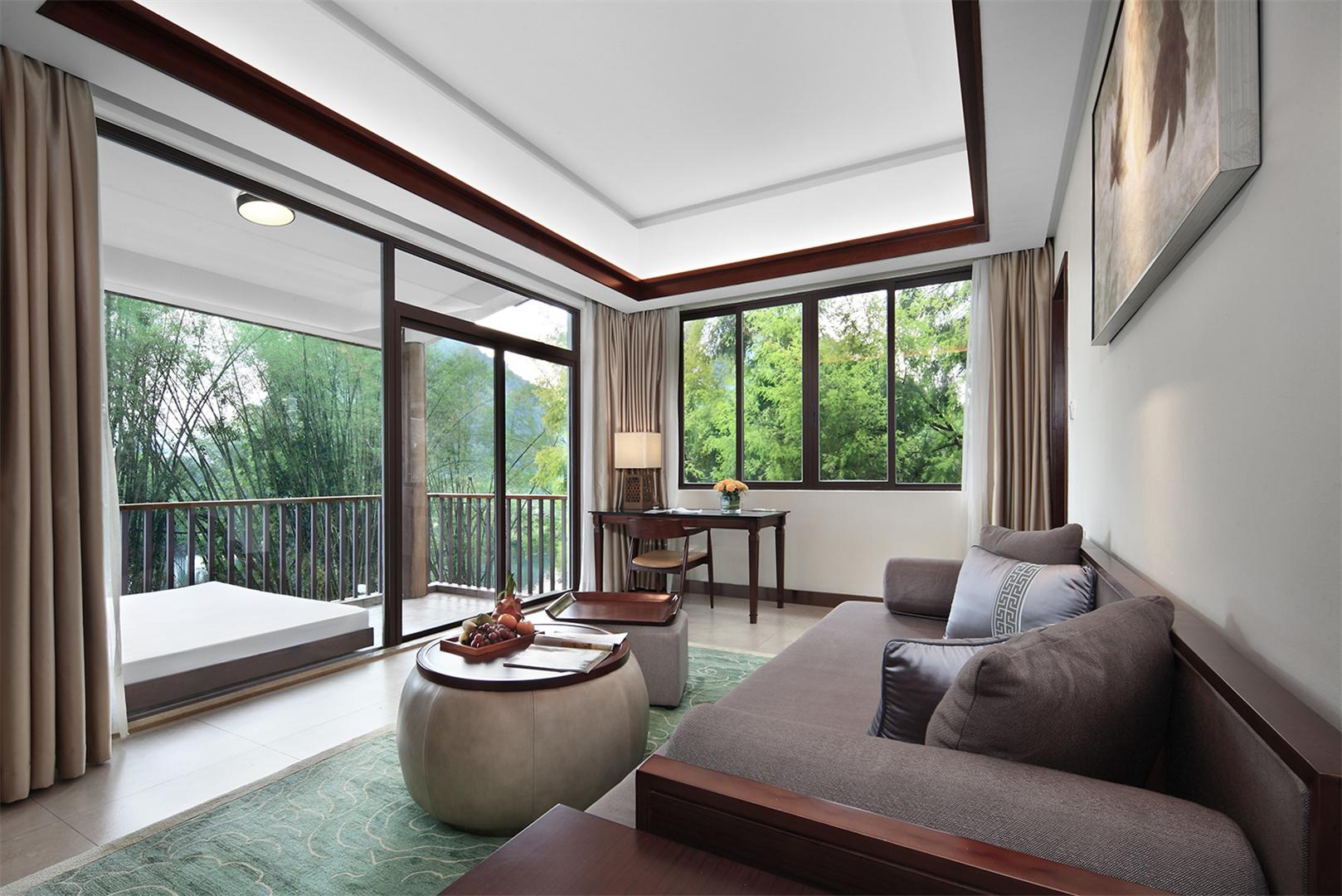 As you step into the suite, you are first greeted by a spacious and bright area. The layout is exquisitely designed, perfectly balancing the needs of rest and relaxation. Through the large floor - to - ceiling windows, the picturesque scenery of the Yulong River unfolds right in front of you. The gentle flowing river, the continuous green mountains and swaying bamboo groves on both banks create a vivid landscape scroll. It exudes a charming appeal, whether it's day or night.